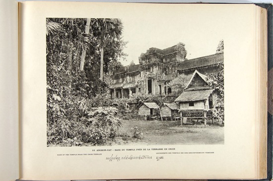1909: Angkor L'Indo-Chine pittoreque & monumentale. Ruines d'Angkor Cambodge. / P[ierre] DIEULEFILS. [Text franz., engl. u. dt.] – Nr. 7/50 auf «Impérial Japon». – Hanoi: Dieulefils 1909. – 4°quer. 16 S. Text, 1 Farbtafel, 67 Bl. Lichtdruck-Tafeln mit Schutzpap. Hldr. Weltbekannt ist Angkor im heutigen Kambodsch durch die Zeugnisse der Baukunst der Khmer in Form einzigartiger Tempelanlagen, allen voran durch den Angkor Wat, den größten Tempelkomplex der Welt. Seit 1992 ist Angkor Weltkulturerbe der Unesco. Photobibliothek.ch 8851