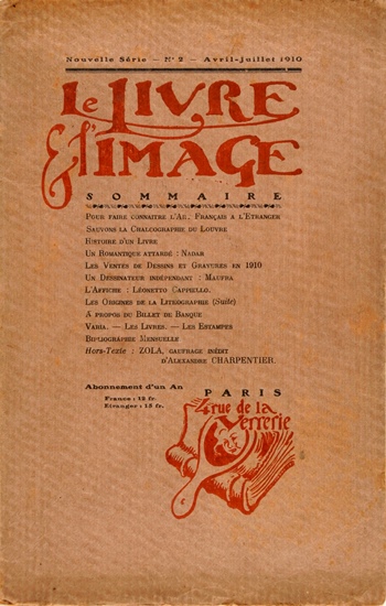 1910: Nachrufe auf Nadar Nachdem Nadar (1820-1910) am 21. März verstorben war, wurde er in zahlreichen Zeitschriften als Schriftsteller, Karikaturist, Photograph und Aeronaut geehrt. Die Bibliothek besitzt zwei Beispiele. —— DIMANCHE ILLUSTRÉ. – No. 14, 3. Avril 1910. – 2°. 18 S. Br. Titelblatt: Nadar - Cet artiste original qui touche à tout et entrevit un des premiers le triomphe du «plus lourd que l'air» [Photo von Paul Nadar]. S. 7: Nadar, de H. de Villemessant. Ref.: Michèle Auer, Nadar, l'hommes aux nombreuses facettes, Kapitel 3 (Abb.). Lebek/Dewitz, Kiosk, S. 10 (Abb.). Photobibliothek.ch 12364 ——— Le LIVRE [ET] L'IMAGE. Est lu par tous les collectionneurs, tous les conservateur des musées de l'etranger, tous les grands Libraires. – Nouvelle série, No. 2, Avril-Juillet 1910. [8] S. Anzeigen, S. 49-104 Text, S. 121-140 Supplement «La Bibliographie mensuelle». Kartonage. S. 60-66: L. Millanvoy, Un Romantique attardé, Nadar. Photobibliothek.ch 15092