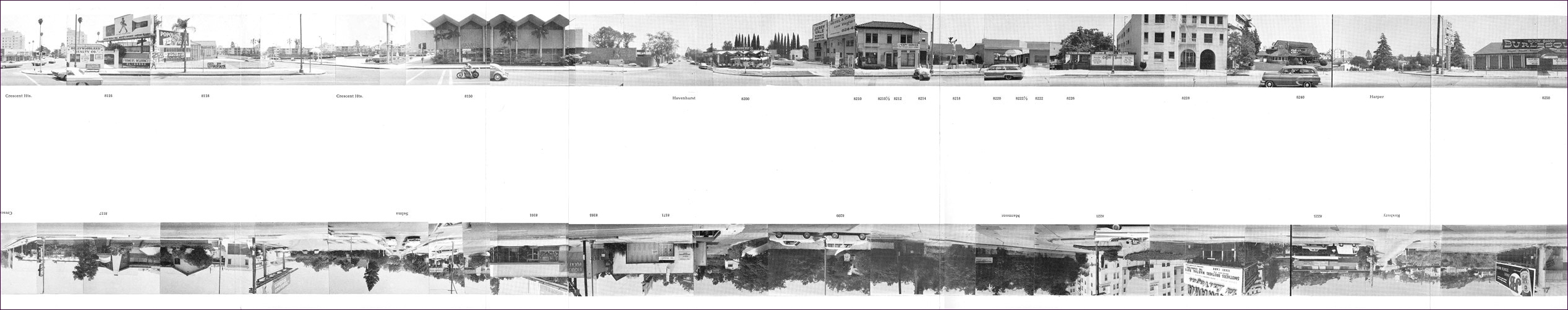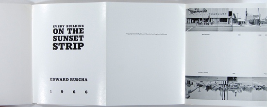 ——— Every Building on the Sunset Strip (1966) Every Building on the Sunset Strip. / Edward RUSCHA. – [First edition, second printing.] – Los Angeles, California: Eigenverlag 1966. – Kl.8°. [53] Bl. Leporello mit Abb. Krt. Weisser Schuber mit Aluminium-Schutzumschlag. «Every Building on the Sunset Strip» war das vierte Künstlerbuch von Edward Ruscha. – «First printing» unterscheidet sich von «second printing» einzig dadurch, dass bei «second printig» der überstehende Papierrest am Schluss des Leporellos korrekt seitenbündig abgeschnitten wurde, während dieser bei «first printing» stehen blieb. Ref.: Tippit, 100 Important 20th-Century Photobooks, Nr. 69. Roth,The Book of 101 Books, S. 182-185 (vollständige Wiedergabe von «first printing»). Parr/Badger, The Photobook, volume II, S. 142/143. Frizot, Neue Geschichte der Fotografie, 1998, S. 722. Photobibliothek.ch 12681