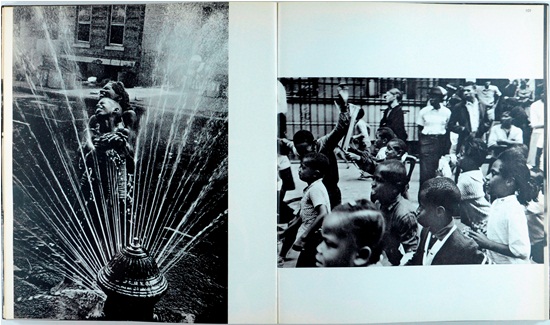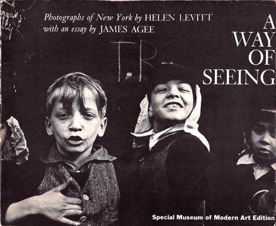 1965: New Yorker Kinder A Way of Seeing. / Photographs of New York by Helen LEVITT, with an essay by James Agee. – Special Museum of Modern Art Edition. – New York: Viking Press 1965. – 8°quer. [8], 78 S. mit [1], 50 Tdr.-Abb. Krt. ill. Helen Levitt (geboren 1913) hatte die Aufnahmen von Kindern in New York bereits in den 40er Jahren gemacht. Auch James Agee (1909-1955), der ein Essay zu den Photos verfasste, war bereits 10 Jahre vor Erscheinen des Buches gestorben. Trotzdem, und nicht von ungefähr, taucht das Buch in allen Kanons der schönsten Photobücher auf. Ref.: Roth, The Book of 101 Books, S. 178/179. Parr/Badger, The Photobook, volume I, S. 252/253. The Open Book, S. 214/215. – Zustand: Blatt mit Abb. 10/11 am Rand zerknittert Photobibliothek.ch 12692