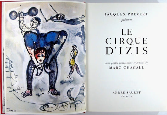 1965: Zirkus Le cirque d'IZIS. / Jacques Prévert. Avec quattre compositions originales de Marc Chagall. – Monte Carlo: André Sauret 1965. – 4°. 171, [1] S. mit Tdr.-Abb., 4 Bl. Farbtafeln. Ln. Photobibliothek.ch 9782