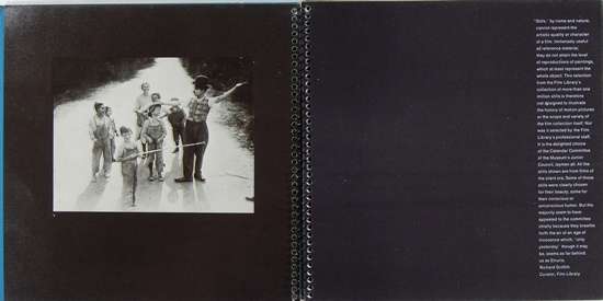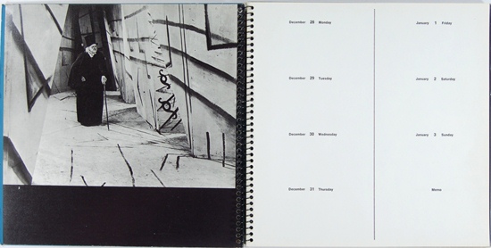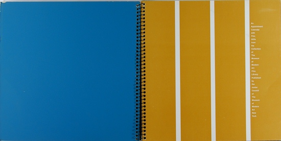 ——— Agenda 1965 (dem Film gewidmet) 1965. An Appointment Calendar with Photographs from the Collection of The MUSEUM OF MODERN ART Film Library. – New York: The Junior Council of The Museum of Modern Art o.J. [1964]. – 8°. [112] S., pro Woche eine Photographie (total 58 Film-Standbilder). Krt. mit bedruckter Kunststoff-Folie und mit Spiralbindung. Photobibliothek.ch 10191
