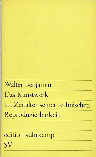 1963: Phototheorie I Das Kunstwerk im Zeitalter seiner technischen Reproduzierbarkeit. Drei Studien zur Kunstsoziologie. / Walter BENJAMIN. – 1.-15. Tsd. – Frankfurt am Main: Suhrkamp 1963. – Kl.8°. 160, [3] S. Krt. SU. – (Edition Suhrkamp ; 028) 1. Das Kunstwerk im Zeitalter seiner technischen Reproduzierbarkeit (Neudruck der ersten Buchausgabe von 1955). 2. Kleine Geschichte der Photographie (erste Buchausgabe des 1931 geschriebenen Essays). 3. Eduard Fuchs, der Sammler und der Historiker (erste Buchausgabe des 1937 geschriebenen Essays). - Die ersten beiden Essays sind die ersten wichtigen phototheoretischen Schriften, später gefolgt von Susan Sontags «Über Fotografie» (Erstausgabe 1977) und Roland Barthes «Die helle Kammer» (1980, deutsche Ausgabe 1985). Ref.: HBK2 00030, 09712. Photobibliothek.ch 3332