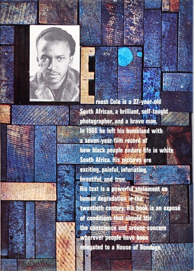 House of Bondage. / By Ernest COLE. With Thomas Flaherty. Introduction by Joseph Lelyveld. – [Englische Erstausgabe.] – London: Allen Lane The Penguin Press 1968. – 4°. 187, [5] S mit Tdr.-Abb. Ln. SU. Ernest Cole (1940-1990) klagte mit diesem Buch das Apartheid-System an. Das Buch war in Südafrika verboten, und Cole emigrierte nach New York. Ein zweites Buch, an dem er arbeitete, wurde nie publiziert. - Die amerikanische Erstausgabe erschien 1967 bei Random House of Canada in Toronto. Ref.: Parr/Badger II, S. 106/107. Photobibliothek.ch 13320