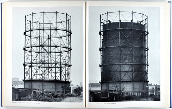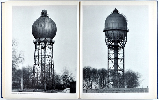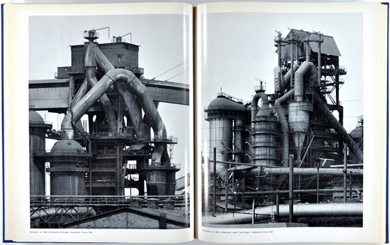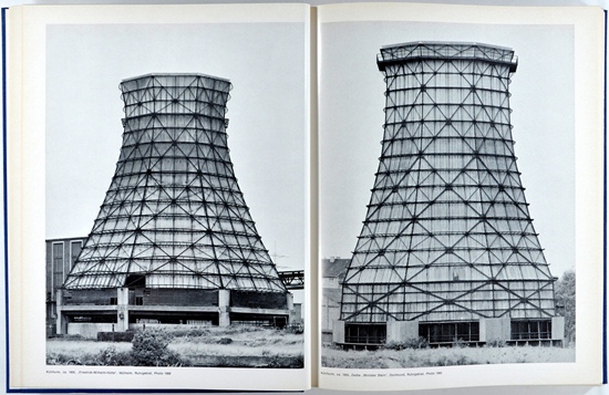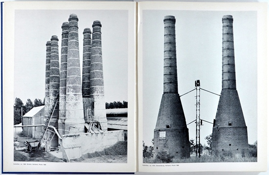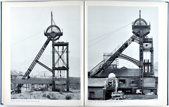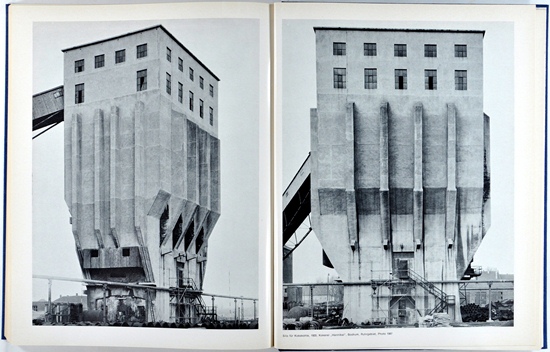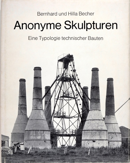 1970-1977: Bernd und Hilla Becher In den 70er und 80er Jahren waren Bernd Becher (1931-2007) und Hilla Becher (geboren 1934) von grossem Einfluss auf die kommende Photographengeneration. Sie dokumentierten Industrieanlagen in einheitlichen Bildserien: immer der gleiche, unverzerrte Bildausschnitt, immer die gleiche Beleuchtung (bewölkter Himmel), immer mit maximaler Tiefenschärfe. In der Stahl- und Kohlekrise verschwanden viele dieser Bauwerke für immer. Die Bechers verstanden sich deshalb als Archäologen der Industriearchitektur. Ihre konzeptuelle Photographie beeinflusste zahlreiche jüngere deutsche Photographen, wie Andreas Gursky, Candida Höfer, Axel Hütte, Thomas Ruff, Jörg Sasse, Thomas Struth. ——— Das erste Buch der Bechers (1970) Anonyme Skulpturen. Eine Typologie technischer Bauten. [Text deutsch, englisch und französisch.] / Bernhard [Bernd] und Hilla BECHER. – [Erstausgabe.] – Düsseldorf: Art Press Verlag 1970. – 4°. [216] S. mit Abb. Dunkelblauer Ganzleinenband. SU «Wir zeigen in diesem Buch Objekte mit vorwiegend geräthaftem Charakter, deren Formen aus der Berechnung entstanden sind und deren Entwicklungsprozess optisch nachvollziehbar ist. Es sind im wesentlichen Bauten, bei denen Anonymität als Stilprinzip erkennbar wird. Ihre Eigentümlichkeiten sind nicht trotz, sondern wegen des Mangels an Gestaltung entstanden.» Ref.: Tippit 10. Roth, S. 194/195. Parr/Badger, vol. II, S. 266. The Open Book, S. 258/259. Photobibliothek.ch 13455