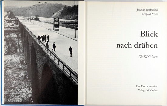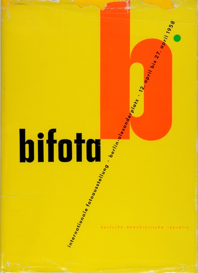 Anfang eines längeren Einschubs Die DDR im PhotobuchDie innerdeutsche Grenze (knapp 1400 km lang) trennte die beiden 1949 gegründeten deutschen Staaten Bundesrepublik Deutschland (BRD) und Deutsche Demokratische Republik (DDR) hermetisch voneinander ab. 1961 wurde durch den Bau der Berliner Mauer (etwa 160 km lang) noch zusätzlich Westberlin von Ostberlin und der DDR abgetrennt. Zwischen dem 13. August 1961 und dem 9. November 1989 war damit Westberlin eine Insel inmitten der DDR. Mit der Wiedervereinigung Deutschlands am 3. Oktober 1990 wurde die Teilung Deutschlands beendigt. Kaum jemand kennt die Photobücher, die in den Jahren der Abriegelung vom Westen in der DDR entstanden sind. Mit freundlicher Unterstützung von Thomas Wiegand (Kassel) werden hier einige typische DDR-Photobücher vorgestellt. Ref.: Wiegand/Heiting, Deutschland im Fotobuch, Göttingen, Steidl, 2011. Berliner Internationale Foto-Ausstellung 3 Jahre nach Edward Steichens «Family of Man» (1955) und 6 Jahre vor Karl Paweks «Weltausstellung der Photographie» (1964) wurde in der DDR eine grosse Photoausstellung mit internationaler Beteiligung organisiert, die Beiträge aus 45 Ländern zeigte, alphabetisch geordnet von Angola bis Vietnam. Die USA waren durch einen einzigen Amateurclub vertreten, die Schweiz durch 4 heute völlig vergessene Photographen. Insgesamt wurden 9 BIFOTA-Ausstellungen durchgeführt, die letzte 1989. ——— BIFOTA 1958 BIFOTA-Bilder. Ein Bildkatalog der 1. Berliner Internationalen Foto-Ausstellung 1958. Der Bildkatalog enthält: 743 katalogisierte Bilder, 114 Grossaufnahmen. / Herausgegeben von Heinz Bronowski. Texte: Heinz Marohn, Gert Prokop. Schutzumschlag-Entwurf: Klaus Wittkugel. – Halle (Saale): Fotokinoverlag Halle 1958. – 4°. 210, [6] S. mit 743 Abb., ungez. ganzseitige Abb. Ganzleinenband. SU. Photobibliothek.ch 16726