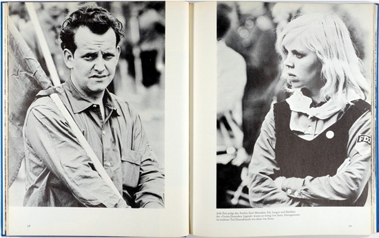 Deutschlandtreffen der Jugend Nach 1950 und 1954 fand über Pfingsten 1964 das dritte und letzte «Deutschlandtreffen der Jugend» in Ostberlin statt. Dazu waren auch Jugendliche aus Westberlin eingeladen. Ein junges DDR-Reporterpaar (Sarah und Rainer Kirsch) berichtet mit einigem Misstrauen gegenüber den westlichen Jugendlichen, «die wohl aus dem grossartigen Schulungscamp kommen, allwo die jugendliche Agitatorenelite Westberlins und der Bundesrepublik fürs Deutschlandtreffen vorbereitet wurde». Die Aufnahmen des DDR-Photographen Thomas Billhardt zeigen ganz normale Jugendliche die ein Fest Fest feiern neben der uniformierten «Elite» der Freien Deutschen Jugend (FDJ). ——— Berlin-Sonnenseite (1964) Berlin-Sonnenseite. Deutschlandtreffen der Jugend in der Hauptstadt der DDR Berlin 1964. / Fotos von Thomas BILLHARDT. Text von Sarah und Rainer Kirsch. – Berlin [Ost]: Verlag Neues Leben 1964. – Gr.8°. 189, [3] S. mit Tiefdruckabbildungen. Halbleinenband illustriert. Photobibliothek.ch 16728