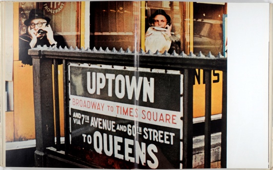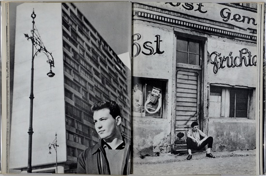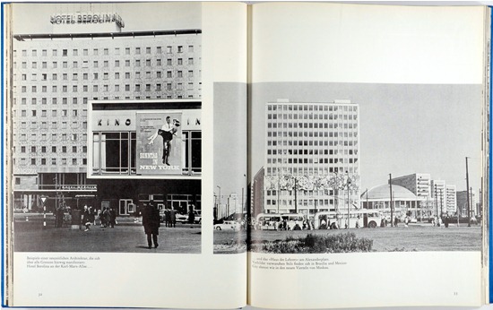 Sehnsucht nach fernen Ländern und Städten Die Berliner Mauer wurde von der DDR-Führung gerne als «Antifaschistischer Schutzwall» bezeichnet, um den eigentliche Zweck der Mauer zu verschleiern, das eigene Volk an der Flucht in Länder zu hindern, denen es noch nicht gelungen war, die «Ketten des Kapitalismus und Imperialismus» zu sprengen. Das Reiseverbot hatte zur Folge, dass fast jeder DDR-Bürger sich nichts sehnlicher wünschte, als einmal in diese Länder und Städte zu reisen. So entstanden Bücher wie «Jeder Tag war schön» (1966), die diese Sehnsucht befridigen sollten. Wie die «legale Flucht» in ferne Länder und Städte den Thorndikes gelang, steht natürlich nicht im Buch. Beim Bildband «New York» wird immerhin auf dem Schutzumschlag begründet, warum die beiden Autoren aus dem Bruderstaat Tschechoslowakei das Buch überhaupt machen konnten: Der Textautor hat einen Forschungsauftrag an der Uno und der Bildautor hat bereits Bildbände über Frankreich und Mexiko für die DDR photographiert. Auch hier sind Vorbilder unschwer erkennbar: Die eingestreuten Texte von Graffitis, Werbesprüchen usw. erinnern an William Kleins «Life Is Good & Good For You In New York» (1956) und die Farbphotos an «Images of a Magic City» in Life (1953) von Ernst Haas. ——— Jeder Tag war schön (1966) Jeder Tag war schön. Erlebnisse, Träume, Geständbisse, notiert zwischen Antwerpen und Bombay. / Annelie Thorndike. Fotografiert von Andrew THORNDIKE. Gestaltet von Heinz Bormann. – Rostock: VEB Hirnstorff Verlag 1966. – Gr.8°. 312 S. mit Abb. (teilweise farbig). Ganzleinenband (grobe Jute). Photobibliothek.ch 16729