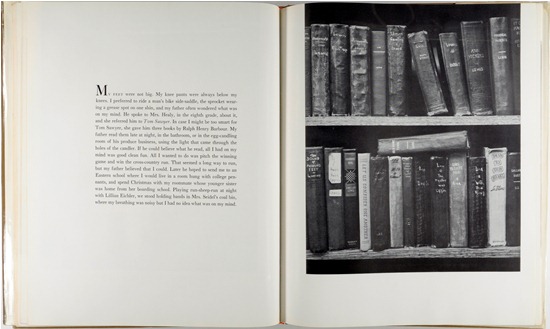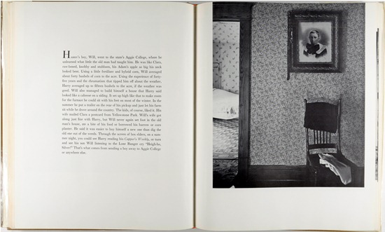 1968: Prosa und Photographie God's Country an My People. / By Wright MORRIS. – First edition. – New York, Evanston, and London: Harper & Row 1968. – 4°. [176] S. mit Abb. Ganzleinenband. SU. Nach «The Inhabitants» von 1946 legte sich Wright Morris (1910-1998) in den 1950er und 1960er Jahren noch verstärkt auf die Kombination von Prosa und Photographie fest. Die Aufnahmen erinnern oft an Walker Evans. Photobibliothek.ch 13919
