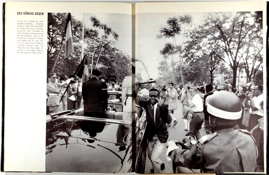 1961: König Baudouin ohne Degen Afrika im Jahre null. Eine Kristall-Reportage. / Robert LEBECK. Text: Horst Bausch. – Hamburg: Hammerich & Lesser 1961. – 4°. [128] S. mit Tdr.-Abb. Krt. SU. Reportage der Zeitschrift «Kristall» mit dem bekannten Bild, auf dem ein junger Kongolese König Baudouin am Vorabend der Unabhängigkeitserklärung den Degen entreisst. Photobibliothek.ch 4356