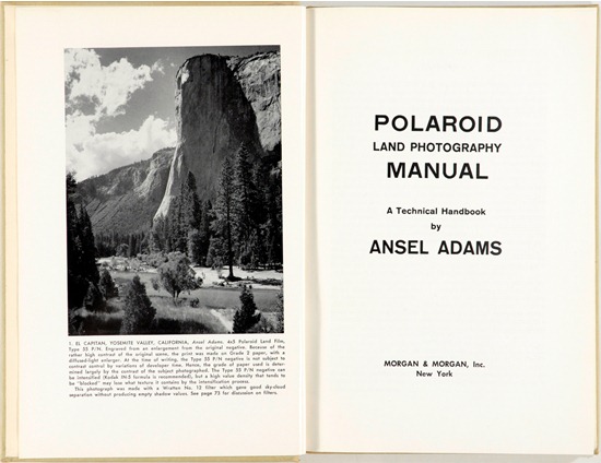 1963: Ansel Adams Arbeit für Polaroid Polaroid Land Photograpy Manual. A Technical Handbook. / Ansel ADAMS. – New York: Morgan & Morgan 1963. – Gr.8°. 192 S. mit 77 Abb. Pbd. SU. 1948 lernte Adams den Physiker Edwin Herbert Land kennen. Land hatte gerade sein neuartiges Polaroid-Land-Trennbildverfahren vorgestellt. Da Land ausschliesslich Wissenschaftler war, engagierte er Adams als künstlerischen Berater. Adams begann sich mit der Qualität und Leistung des Materials auseinanderzusetzen, woraus sich schliesslich eine lebenslange geschäftliche Beziehung zwischen Adams und Polaroid ergab. - S. 81-112 (Abb. 27-58): Tafeln mit Photos von Ansel Adams u.a. in exzellenter Drucktechnik. Ref.: Nicht bei R&S. Photobibliothek.ch 3216