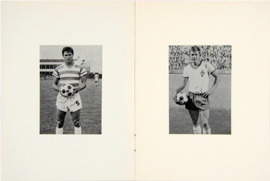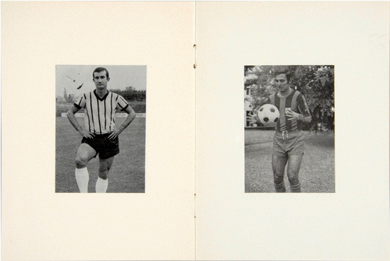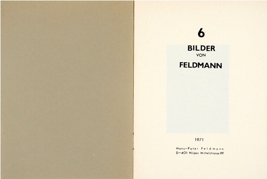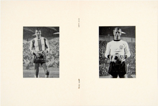 1968-1974: Künstlerbücher von Hans-Peter Feldmann Ein Grossteil der künstlerischen Produktion vom deutschen Photographen Hans-Peter Feldmann (geboren 1941) besteht aus gestohlenen Bildern. Sein Konzept basiert auf der Erkenntnis, dass Bilder allen gehören und in verschiedenen Zusammenhängen und Zusammenstellungen unterschiedliche Bedeutungen entwickeln. Zwischen 1968 und 1974 schuf Feldmann insgesamt 35 Bilderhefte, die er in Kleinstauflage im Eigenverlag vertrieb. ——— 6 Bilder von Fussballspielern (1971) 6 Bilder von Feldmann. / Hans-Peter FELDMANN. – Hilden: Eigenverlag 1971. – 16°. [8] S. mit 6 Abb. Broschur gestempelt. Das vorliegende Bildheft «6 Bilder» zeigt 6 Fussballspieler. Ref.: Parr/Badger, The Photobook, volume 2, S. 158-161. The Open Book, S. 234/235. Auer, Photobooks, S. 560. Photobibliothek.ch 12997