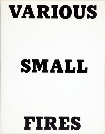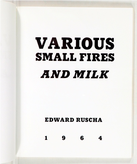 ——— Various Small Fires and Milk (1964/1970) Various Small Fires and Milk. / Edward RUSCHA. – Second edition, 3000 copies. – Los Angeles: Printed by Anderson, Ritchie & Simon 1964/1970. – Kl.8°. [24] Bl. mit [16] Abb. Krt. Original Pergamin-Schutzumschlag. «Various Small Fires and Milk» war das zweite Künstlerbuch von Edward Ruscha. Ref.: Parr/Badger, The Photobook, volume II, S. 140/141. The Open Book, S. 198-201. Photobibliothek.ch 12729