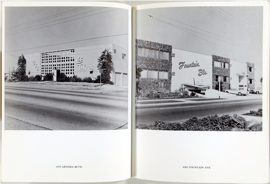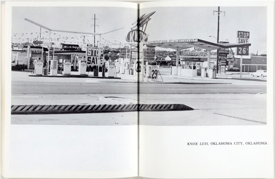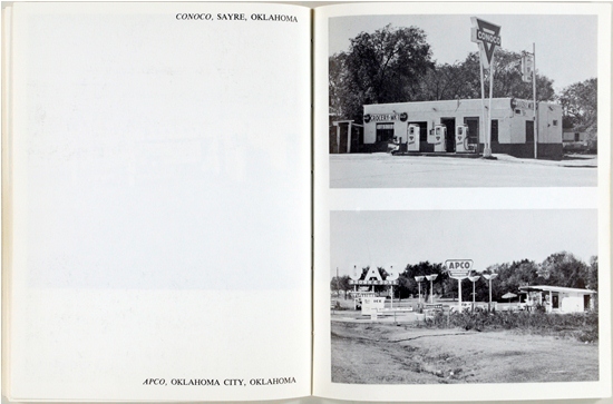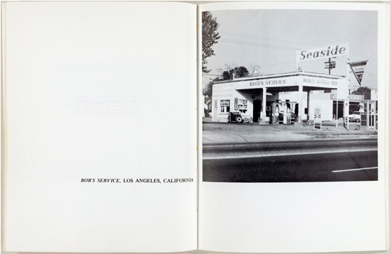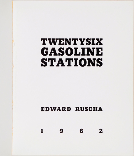 1962-1978: Künstlerbücher von Edward Ruscha Der Amerikaner Edward Ruscha (geboren 1937) veröffentlichte ab 1962 insgesamt 18 Künstlerbücher, die heute zu den gesuchtesten Photobüchern überhaupt zählen. Ruschas Konzept war es, Bilder zu einem Thema – etwa Tankstellen, Feuerstellen, Wohnhäuser usw. – in handlichen kleinen Büchern zu «inventarisieren», wobei die Bildserien dann oft noch durch ein davon völlig abweichendes Einzelbild ergänzt wurden. Ruschas bekannteste Arbeit ist wohl «Every Building on the Sunset Strip»: Mit einer auf das Dach seines Autos montierten motorisierten Nikon photographierte Ruscha alle Gebäude am Sunset Strip in Los Angeles und montierte dann die beiden Strassenseiten kopfstehend einander gegenüber auf einen Leporello. ——— Twentysix Gasoline Stations (1962/1969) Twentysix Gasoline Stations. / Edward RUSCHA. – Third edition, 3000 copies. – Alhambra, California: The Cunningham Press 1962/1969. – Kl.8°. [48] S. mit [26] Abb. Kartonage. «Twentysix Gasoline Staions» war das erste Künstlerbuch von Edward Ruscha. Ref.: Parr/Badger, The Photobook, volume II, S. 140/141. The Open Book, S. 198-201. Photobibliothek.ch 14910
