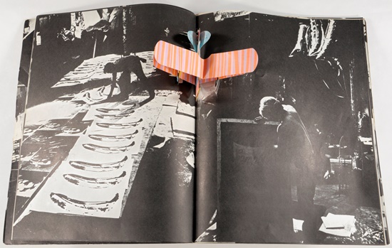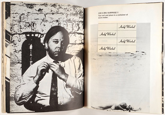 1967: Pop-Art-Buch aus Andy Warhol's Factory Andy WARHOL's Index (Book). / With the assistance of Stephen Shore, Paul Morrissey, Ondine, Nico, Alan Rinzler, Christopher Cerf, Gerald Harrison, Akihito Shirakawa and particularly David Paul. Serval photographs by Nat Finkelstein. Factory Fotos by Billy Name. – First Printing [paperbound issue]. – New York: Random House 1967. – 4°. [78] S. mit Abb., [10] dazwischen hineingelegte bzw. hineinmontierte Attraktionen. Silbrig illustrierter Kartonage-Einband. – (A Black Star Book) Das berühmte Pop-Art-Buch aus Andy Warhol's Factory erschien gleichzeitig als «hardbound issue» und als «paperbound issue» (vorliegend). Das Buch enhält 10 hineingelegte bzw. hineinmontierte Attraktionen, die nur selten vollständig vorhanden sind. Es sind dies (in der Reihenfolge ihres Auftretens): 1) Aufwendiges Pop-up einer Burg «Were attacked constantly». 2) Pop-up einer roten Ziehharmonika (ursprünglich mit Ton). 3) Pop-up eines bunten Flugzeugs. 4) Paper disc «The Chelsea Girls» auf Stahlfeder. 5) Herausspringender Diamant an einer schwarzen Schnur (ursprünglich mit drei Klebern am herausspringen gehindert). 6) Flexi disc 45 rpm «Velvet Underground» mit Bildnis von Lou Reed zum ausreissen. 7) Nase mit farbigen Streifen. 8) Pop-up einer Konservendose «Hunt's Tomato Paste». 9) Acht Abreiss-Schwämmchen, vier davon signiert «Andy Warhol» mit dem Hinweis «FOR A BIG SURPRISE!!! Tear out and place in a container of warm water». 10) Ballon (wenn noch vorhanden, geschrumpft und verklebt zwischen den Seiten). Photobibliothek.ch 11866 und 15572 Fast immer fehlt etwas von den Attraktionen. Photobibliothek besitzt zwei Exemplare, die zusammen vollständig sind. Bei Exemplar 11866 fehlt Attraktion 4 «The Chelsea Girls», und bei Exemplar 15572 fehlen bei Attraktion 8 vier der acht Abreiss-Schwämmchen.