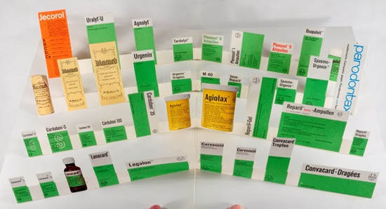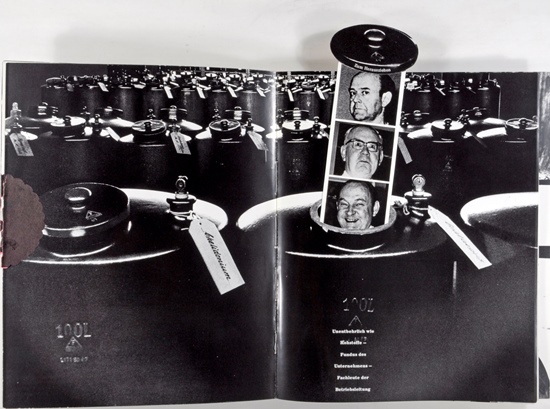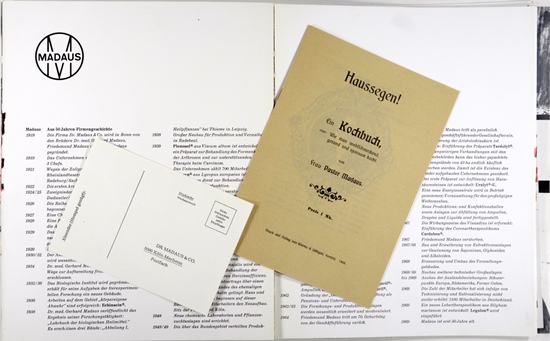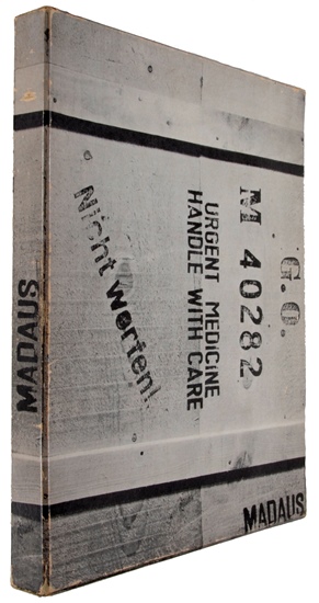 1969: Reminiszenz an Andy Warhol 50 Jahre MADAUS - Eine aufgeschlossene Firma. / Gestaltung: Werbeagentur Peter Selinka, Ravensburg. Redaktion: Siegfried Leuselhardt. Fotos: Barbara Schulten. – [Erstausgabe.] – Köln am Rhein: Dr. Madaus & Co. o.J. [1969]. – 4°. [72] S. mit Abb. und [16] lose beigelegten oder montierten Attraktionen. Kartonage illustriert in illustriertem Pappschuber. Reminiszenz an Andy Warhols «Index (Book)» von 1967. Die 16 lose beigelegten oder montierten Attraktionen sind im Einzelnen (in der Reihenfolge ihres Auftretens): Ref.: Parr/Badger, The Photobook, volume II, S. 196/197. Zustand: Siegel aufgeschnitten, es fehlt das lose beigelegte Webeplakat (Nr. 12). Photobibliothek.ch 15999