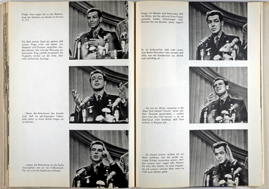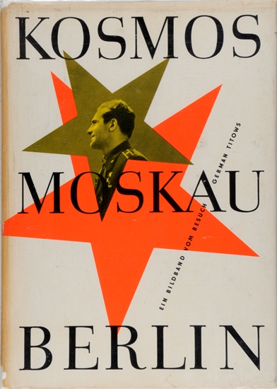 Besuch des sowjetischen Kosmonauten German Titow in der DDR Vom 1. bis 5. September 1961 besuchte der sowjetische Kosmonaut German Titow die DDR. Er hatte die Erde am 6./7. August 1961 17-mal umrundet. Damit war er der zweite sowjetische Astronaut (nach Juri Gagarin) bzw. der dritte weltweit (nach Alan Shepard, der allerdings die Erde nicht umrundete). ——— Kosmos Moskau Berlin (1961) KOSMOS MOSKAU BERLIN. Ein Bildband vom Besuch German Titows in der DDR. / Die Zusammenstellung und grafische Gestaltung des Innenteils besorgte Freimut Kessner. Den Schutzumschlag und den Einband gestaltete Klaus Wittkugel. – 1. Auflage. – Berlin [Ost]: Verlag Kultur und Fortschritt 1961. – 4°. 191, [1] S. mit Abb. Ganzleinenband mit Goldprägedruck.. SU. Photobibliothek.ch 16731
