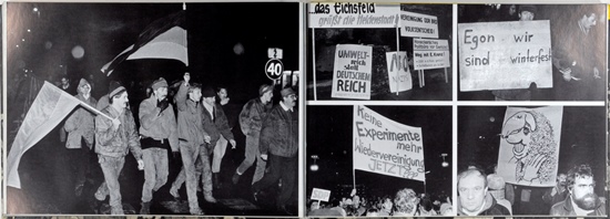Das Ende der DDR Massendemonstrationen, die als «Montagsdemonstrationen» in die Geschichte eingingen, führten im Herbst 1989 zur «Friedlichen Revolution» in der DDR. Die erste Montagsdemonstration fand am 4. September 1989 in Leipzig statt und weitete sich schnell auf andere Städte aus. Mit dem Ruf «Wir sind das Volk» protestierten Hunderttausende DDR-Bürger im ganzen Land gegen die herrschenden politischen Verhältnisse, was am 9. November 1989 zum Fall der Berliner Mauer führte. ——— Leipziger Demontagebuch (1990) Leipziger Demontagebuch. Demo, Montag, Tagebuch, Demontage. / Zusammengestellt und mit einer Chronik von Wolfgang SCHNEIDER. – Erste Auflage. – Leipzig und Weimar: Gustav Kiepenheuer 1990. – 8°quer. 184 S. mit Abb. Pappband illustriert. Ref.: Parr/Badger, volume III, S. 70. Photobibliothek.ch 16734