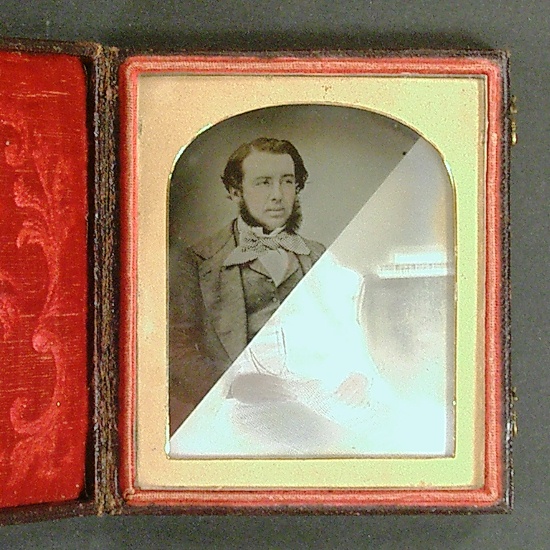 Ida Chamberlin at Wellesley Hills, Cyanotypie, 1885 DAGUERREOTYPIE (1839-1860) Andere Bezeichnungen: Daguerréotypie (f), Daguerreotype (e) Verfahren: Direkt-Positiv (Unikat) Geschichte: Erstes praktikables photographisches Verfahren, erfunden von Louis Jacques Mandé Daguerre (nach Vorarbeiten durch Nicéphore Niépce). 1839 veröffentlicht, vom französischen Staat gekauft und «der Welt geschenkt». Beschrieb: Eine versilberte Kupferplatte wird mittels Joddampf lichtempfindlich gemacht, nach der Belichtung in Quecksilberdampf «entwickelt» und mit Natriumthiosulfat fixiert. Belichtungszeit: 1839 15...30 min, konnte später auf 10...60 s reduziert werden. Merkmale: Die Lichter bestehen aus weissem Amalgam und die Schatten aus spiegelndem Silber, weshalb zur Betrachtung der Hintergrund möglichst dunkel sein sollte. Referenzen: Gernsheim, Geschichte der Photographie, 1983, S. 55-65. Agfa Foto-Historama, Silber und Salz, 1989, S. 624-634.