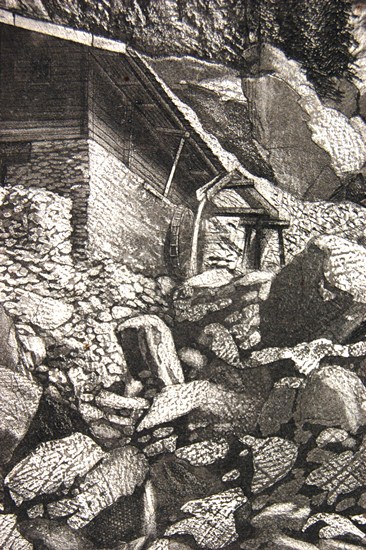 Eine Bergmühle bei Tiefenkasten Canton Graubünden, Aquatinta, ca. 1850, Ausschnitt im Original 7,5 x 5 cm ARISTOPAPIER (1885-1920) Andere Bezeichnungen: Gelatine-Silber-Print (allg.), gelatin printing-out paper (e) Verfahren: Auskopierpapier Geschichte: 1882 durch William W. Abbney erfunden. 1885 durch Barker verbessert. 1886 «Aristo» von Liesegang, 1891 «P.O.P.» von Ilford, 1892 «Solio» von Kodak. Beschrieb: Lichtempfindliches Chlorsilbersalz in Gelatineschicht auf Barytunterlage. Merkmale: Schicht quillt und ist nicht acetonlöslich. Immer mit Barytgrund. Oberflächen: Glänzend, halbmatt, tiefmatt. Farbe: Rotbraun bis braunschwarz. Papierstärke: 0,12...0,15 mm. Sichere Unterscheidung von Gaslichtpapier nur mikroskopisch möglich. Referenzen: Museum Folkwang, Verfahren der Fotografie, 1989, S. 63.