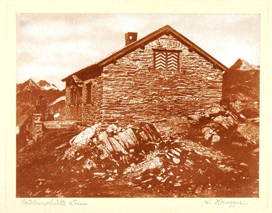 Jean Honegger, Cadlimohütte Tessin, Bromöldruck, 1930 BROMÖLUMDRUCK (1909-1940) Verfahren: Edeldruck Geschichte: C. H. Hewitt publizierte 1909 ein Verfahren für den Umdruck von Bromöldrucken. Beschrieb: Ein frisch eingefärbte Bromöldruck wird in einer Kupferdruckpresse auf ein nicht beschichtetes Kupferdruckpapier übertragen. Mehrfachdrucke in Schwarzweiss (grösserer Tonumfang) oder in Farbe. Merkmale: Papier ohne Beschichtung. Farbe liegt auf der Oberfläche der Papierstruktur. Doppelte Konturen bei Mehrfachdrucken (siehe «Monte Dito» unten). Sicher als Bromölumdrucke identifiziert werden können direkt auf grössere Kartons gedruckte Umdrucke (nicht montiert!). Bei unbeschnittenen Drucken ist manchmal ein Druckrand erkennbar. Referenzen: Heidtmann, Kunstphotographische Edeldruckverfahren, 3. Aufl., 1982, S. 121 ff. Museum Folkwang, Verfahren der Fotografie, 1989, S. 74.