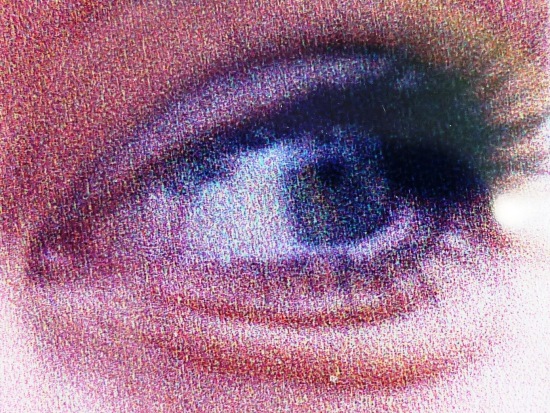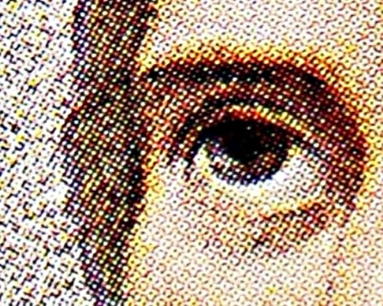 Bei starker Vergrösserung sind stochastisch verteilte Rasterpunkte in Form von Farbspritzern erkennbar.