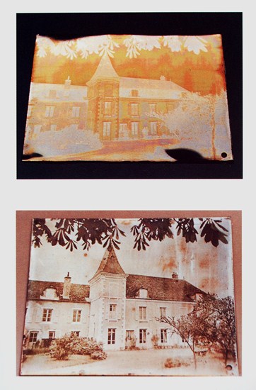 Rekonstruktion einer Heliographie aufgrund von «Notice sur Héliograpie» durch Jean-Louis Marignier im Jahre 1989. Oben: Asphalt auf Silber ergibt den Eindruck eines Negativs. Unten: Das Positiv entsteht nach Umkehr mittels Joddampf und Abwaschen des Asphalts mit Alkohol. (Bilder aus: Marignier, Héliographies, 1989) (Photobibliothek.ch 10241)