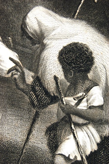 Der Besuch, Radierung mit Hilfstechniken, ca. 1850, HILFSTECHNIKEN FÜR STICHE (1600-heute) Andere Bezeichnungen: Roulette, Moulette, Matoir, Karborundstift, Drahtbürste Verfahren: Tiefdruck Geschichte: Bereits die Graveure des 17. Jahrhunderts verfügten über Instrumente zur unterschiedlichen Tonwertgebung mittels geeigneter Muster. Beschrieb: Erzeugung von punktierten Linien, Bändern oder Flächen mit beidseitig (Roulette) oder einseitig (Moulette) geführtem Rädchen oder Keule (Matoir) mit scharfen Spitzen. Karborundstift und Drahtbürste ergeben graue Linien und Flächen. Merkmale: Roulette bzw. Moulette = dreieckige und viereckige Punkte in gleichmässigen Reihen. Matoir = ungleichmässige Punkte. Karborundstift und Drahtbürste ergeben ein haariges Filzmuster. Referenzen: Van der Linden, Handbuch der grafischen Techniken, 2. Aufl., 1986, S. 122/123. >>> Kupferstich
