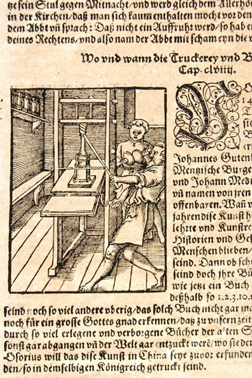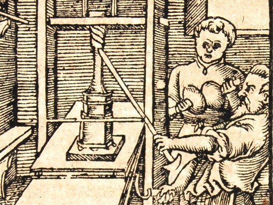 Sebastian Münster, Cosmographia universalis, Bleisatz mit Holzschnitt, 1628; der Holzschnitt konnte zusammen mit dem Bleisatz gedruckt werden, weil beides Hochdruckverfahren sind