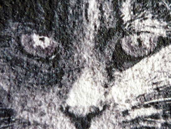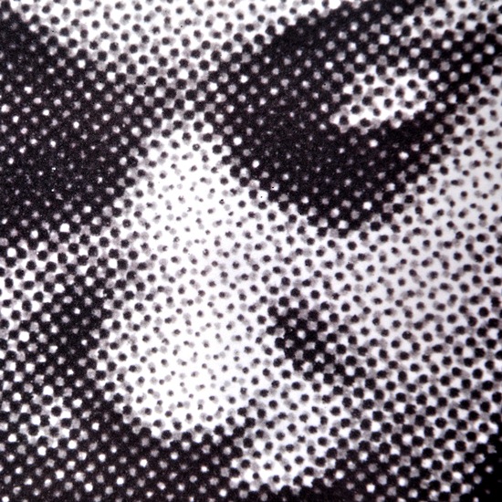 Digitalphotographie ausbelichtet auf Fujicolor Crystal Archive Paper. Bei starker Vergrösserung ist ein quadratischer Raster erkennbar. DUOTONE-OFFSETDRUCK (1975-heute) Andere Bezeichnungen: Duotone offset (e) Verfahren: Flachdruck Geschichte: Heute übliche Drucktechnik für anspuchsvolle Schwarzweissreproduktionen. Beschrieb: Neben dem schwarzen Raster ergibt ein zweiter, grauer Raster einen grösseren Tonwertumfang. Merkmale: Gleichmässiges Raster mit schwarzen und grauen Rasterpunkten unterschiedlicher Grösse (gleichmässige Färbung bis zum Rand). Referenzen: Benson, The Printed Picture, MoMA, 2008, S. 258-265.