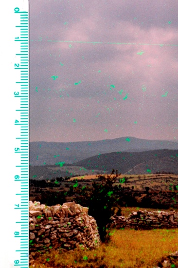 Das spiegelverkehrte Bild wird im Gegenlicht erkennbar BARYT-FARBPHOTOPAPIER (1942-1970) Verfahren: Chromogenes (farbstoffbildendes) Negativ-Positiv-Farbverfahren Geschichte: 1941 durch Agfa und 1942 durch Kodak auf den Markt gebracht. Zunächst nur durch das Militär genutzt, erst ab etwa 1950 breite Anwendung im Amateurbereich. Ab 1970 durch das PE-Farbphotopapier abgelöst. Beschrieb: Drei oder mehr chromogen entwickelte Farbschichten auf Papier mit Barytgrund. Merkmale: Staub wird beim Vergrössern weiss abgebildet. Die Unterlage besteht aus festem Papier mit Barytgrund. Die Rückseite ist mit Bleistift gut beschriftbar (im Gegensatz zum späteren PE-Farbphotopapier. Referenzen: Museum Folkwang, Verfahren der Fotografie, 1989, S. 67.