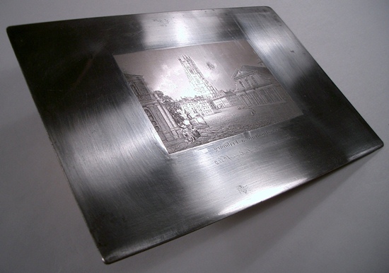 Johann Heinrich Locher, La Cathedrale à Fribourg, Stahlstichplatte, ca. 1850; das spiegelverkehrte Bild wird im Gegenlicht sichtbar STRICHÄTZUNG (1880-1970) Andere Bezeichnungen: Sammelbegriff für chemische Hochdruckverfahren als Holzstich-Ersatz Verfahren: Hochdruck Geschichte: Ab etwa 1880 bekam der Holzstich zunehmend Konkurrenz durch chemische Hochdruckverfahren. Beschrieb: Umdruck oder photographische Übertragung einer Stichvorlage auf eine Hochdruckplatte (meist aus Zink, 1,6...2,0 mm dick). Merkmale: Typische Hochdruckmerkmale (Quetschrand und Schattierung). Im Unterschied zum Holzstich sind Kreuzungspunkte von schwarzen Linien problemlos möglich (siehe Beispiele unten). Referenzen: Krüger, Die Illustrationsverfahren, 1914, S. 47-74.