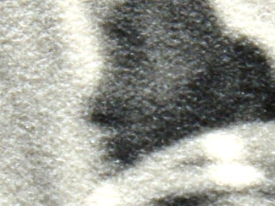 Zum Vergleich ein Holzstich: Kreuzungspunkte von schwarzen Linien gibt es so gut wie nicht, und wenn doch, sind sie durch weisse Linien vorgetäuscht. TEXTILPAPIER (1931-1950) Andere Bezeichnungen: Gelatine-Silber-Print (allg.) Verfahren: Entwicklungspapier für Vergrösserungen Geschichte: Anfangs der 30er Jahre durch Gevaert (Belgien) unter der Bezeichnung «Gevalux» auf den Markt gebracht und in Deutschland durch Voigtländer vertrieben. «Gravura» von Mimosa hat eine ähnliche Oberfläche und kann deshalb wohl auch zu den Textilpapieren gezählt werden (Muster in der Sammlung). Beschrieb: Bromsilberpapier mit senkrecht auf der Papieroberfläche stehenden Härchen, die mit Emulsion umgeben sind. Merkmale: Problemlos erkennbar an der «samtigen» Oberfläche. Referenzen: Hansch, Frühe Photogarphien, 1985, S. 85-86.