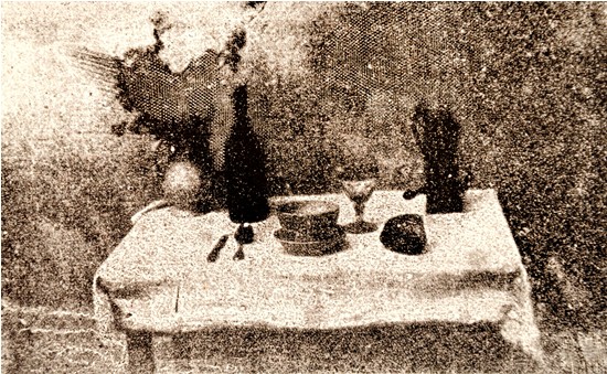 Xeroxkopie von 1975 (Ausschnitt): Schrift konnte tadellos kopiert werden, aber bei grossen Flächen wurde der Toner nur an den Ränder elektrostatisch angezogen PHYSAUTOTYPIE (1832) Verfahren: Direkt-Positiv (Unikat) Geschichte: Durch Niépce und Daguerre 1832 gemeinsam erfundenes Verfahren. Wahrscheinlich ist «La table servie» eine Physautotypie. Die Platte ist zwar verschollen und nur als Reproduktion von Davanne aus dem Jahre 1893 erhalten, aber Jean-Louis Marignier gelang 2004 der Nachweis aufgrund des Briefwechsels von Niépce und Daguerre. Beschrieb: Destilationsrückstände einer Lavendelessenz auf einer Silberplatte. Referenzen: Verschiedene Beiträge von Jean-Louis Marignier im Internet.