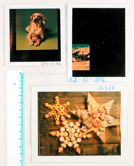 Polaroid-Aufnahmen in verschiedenen Formaten (datiert 1977 bis 1982), links oben in einer Hasselblad-Kamera, rechts oben in einer Kleinbildkamera und unten in einer Fachkamera (z.B. Sinar) belichtet