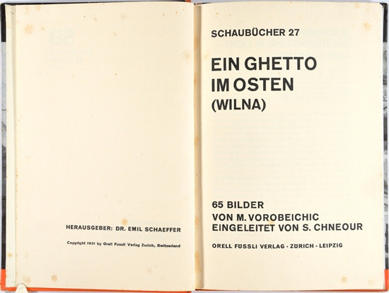 SchaubücherZwischen 1929 und 1932 brachte Emil Schaeffer die Buchreihe «Schaubücher» im Verlag Orell Füssli in Zürich und Leipzig heraus. Die deutschsprachige Originalausgabe umfasst 38 Bände. 6 dieser Bände wurden ins Englische übersetzt und erschienen als Lizenzausgaben im Verlag Routledge & Sons in London. Das gesuchteste Schaubuch ist Band 27 «Ein Ghetto im Osten (Wilna)» von Moses Vorobeichic (später Moï Ver). Davon gibt es drei Ausgaben: 1. die deutsch/hebräische Ausgabe; 2. die deutsch/jiddische Ausgabe; 3. die englisch/hebräische Ausgabe «The Ghetto Lane in Wilna». (1) und (2) unterscheiden sich, ausser dem hebräischen bzw. jiddischen Text, durch ein H bzw. J auf dem Rücken. Alle drei Varianten geben als Erscheinungsjahr 1931 an.