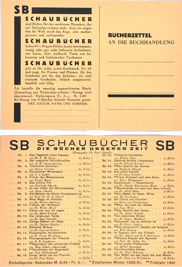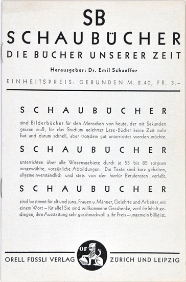 Bücherzettel und ProspekteSchaubücher. Prospekt der 1. und 2. Reihe [= Bd. 1-12]. / ORELL FÜSSLI. Herausgeber Emil Schaeffer. – Zürich u. Leipzig: Orell Füssli o.J. [ca. 1930]. – 8°. 14 S. Leporello. – (Schaubücher ; Prospekt 01-12) Dieser Leporello-Prospekt mit 14 Seiten beschreibt alle Bände der 1. und 2. Reihe (= Band 1-12) je auf einer eigenen Seite. Photobibliothek.ch 10512