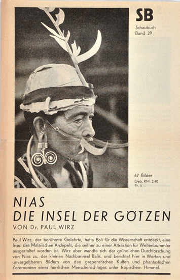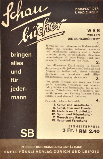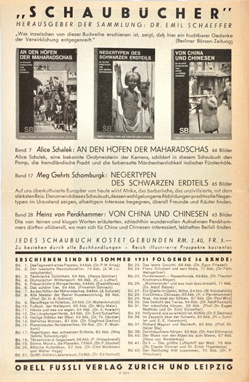 «Schaubücher». Herausgeber der Sammlung: Emil Schaeffer. / ORELL FÜSSLI. – Zürich u. Leipzig: Orell Füssli 1931. – 8°. 1 Bl. – (Schaubücher ; Prospekt 07/17/28/29) Bücherzettel mit ausführlicher Beschreibung der Bände 29 (1 ganze Seite), 7, 17 und 28 sowie einer Liste der bis Sommer 1931 tatsächlich erschienenen Bände (es fehlen noch die Bände 32 «Goethe und Goethestätten» und 38 «Davos, die Sonnenstadt im Hochgebirge»; dies ist die vollständigste Liste, die sich in der Sammlung befindet. Photobibliothek.ch 411 Lizenzausgaben im Verlag Routledge & Kegan in LondonSechs der 38 im Orell Füssli Verlag erschienenen Bände wurden ins Englische übersetzt und erschienen als Lizenzausgaben unter dem Reihentitel «Seen by the Camera» im Verlag Routledge & Sons in London. «Seen by the Camera» Band 3 NEGRO TYPES. 64 pictures. / [Photographien von Hugo A. Bernatzik, Walter Mittelholzer, Meg Gehrts Schomburgk u.a.] – London: Routledge & Sons o.J. [1932]. – 8°. xv, [1] S. Text, [64] S. mit 65 Abb. Pappband. SU. – (Seen by the Camera ; 3) Englische Ausgabe von «Negertypen des schwarzen Erdteils» (Schaubücher Band 17). Der Autor der deutschen Ausgabe Meg Gehrts Schomburgk wird nur in den Bildlegenden erwähnt. Ref.: Heiting/Jaeger, Bd.1, S. 329. Photobibliothek.ch 14064 «Seen by the Camera» Band 4 Hollywood as it Really is. 60 pictures. / With an introduction and explanations by E[rwin] DEBRIES. – London: Routledge & Sons o.J. [1932]. – 8°. xvi S. Text, [56] S. mit 60 Abb. Pappband. SU. – (Seen by the Camera ; 4) Englische Ausgabe von «Hollywood, wie es wirklich ist» (Schaubücher Band 33). Ref.: Heiting/Jaeger, Autopsie Bd.1, S. 329. Photobibliothek.ch 14080 Gemäss Stefan Kern [1] sind noch folgende weiteren Titel erschienen: