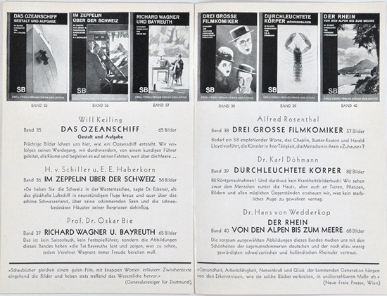 Übersicht der deutschsprachigen OriginalausgabenDie Bandzählung der deutschsprachigen Originalausgabe lautet: 1-15, 17-21, 23-33, 36-41 und 43. Nicht erschienen sind die Bände 16 «Formensprache der Pflanzen», 22 «Das Gesicht der Blumen», 34 «Wolfgang Amadeus Mozart», 35 «Das Ozeanschiff» und 42 «Istanbul». Band 38 wurde ursprünglich als «Drei grosse Filmkomiker» angekündigt; dieser Band erschien jedoch nie, stattdessen erschien als Band 38 «Davos, die Sonnenstadt im Hochgebirge». Alle deutschsprachigen Originalausgaben befinden sich in der Sammlung. Mehrheitlich haben die Halbleinenbände das Format 19,5 x 13 cm (8°).