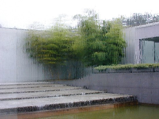 ... und ein Blick durch die verregnete Scheibe auf den kleinen Wasserfall.