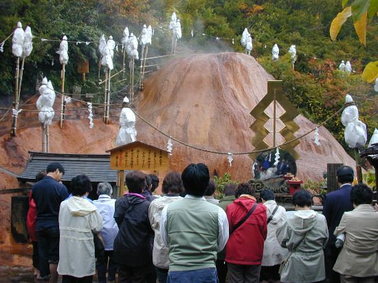 Der heiligste von den drei Bergen ist der Yudono-san. Höhepunkt ist der dampfende, orange Felsen, der von heissem Quellwasser überflossen wird, und nur barfuss bestiegen werden darf.